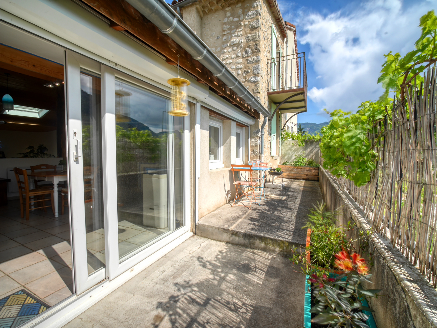 Côté cuisine, une grande baie vitrée inonde la pièce de lumière et ouvre le regard sur un panorama de vignes et de montagnes dont les 3 becs; Côté séjour, une atmosphère chaleureuse , avec un espace lounge intimiste, un poêle à bois, des courbes douces et des pierres apparentes surgissant des murs sont des fragments d’histoire.